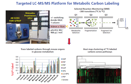 对于体内标记实验,D-葡萄糖(U-13C6,99%)或 L-谷氨酰胺(13C5,99%)溶液通过腹膜内注射 (IP) 或颈静脉递送至肿瘤并进行比较。使用 80% 甲醇从细胞或肿瘤组织中提取代谢物。利用现代仪器,可以并行测量数十种以上物种的同位素标记,从而实现系统级通量定量。