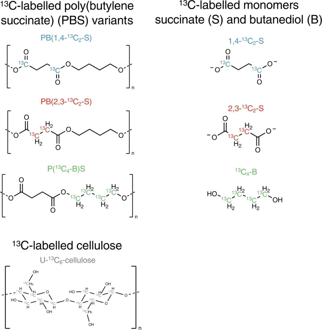 在这项研究中,研究人员以聚丁二酸丁二醇酯(PBS)(一种合成聚酯)作为土壤生物降解的聚合物模型。通过使用基于稳定碳同位素13C标记的合成聚合物作为底物的分析工作流程,提供了长期土壤培养过程中聚合物生物降解的大量数据。更具体地说,使用三种13C-PBS变体,(即PB(1,4-13C2-S)、PB( 2,3-13C2-S)和P(13C4-B)S)。同时补充了PBS土壤生物降解的研究,在同一土壤中培养13C标记的单体(1,4-13C2)丁二酸、(2,3-13C2)丁二酸和13C4丁二醇( B ),以评估单体和相应的PBS变体的矿化动力学差异。
